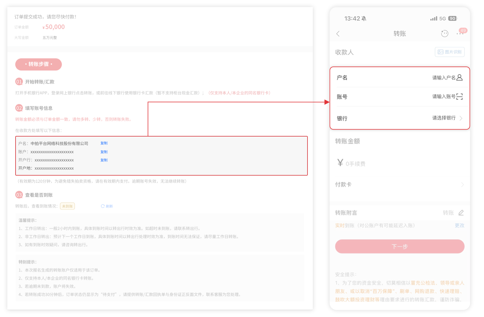 2、提交订单,根据页面信息,打开手机银行APP,登录网上银行点击转账,或前往线下银行使用银行卡汇款(暂不支持柜台现金汇款)。
